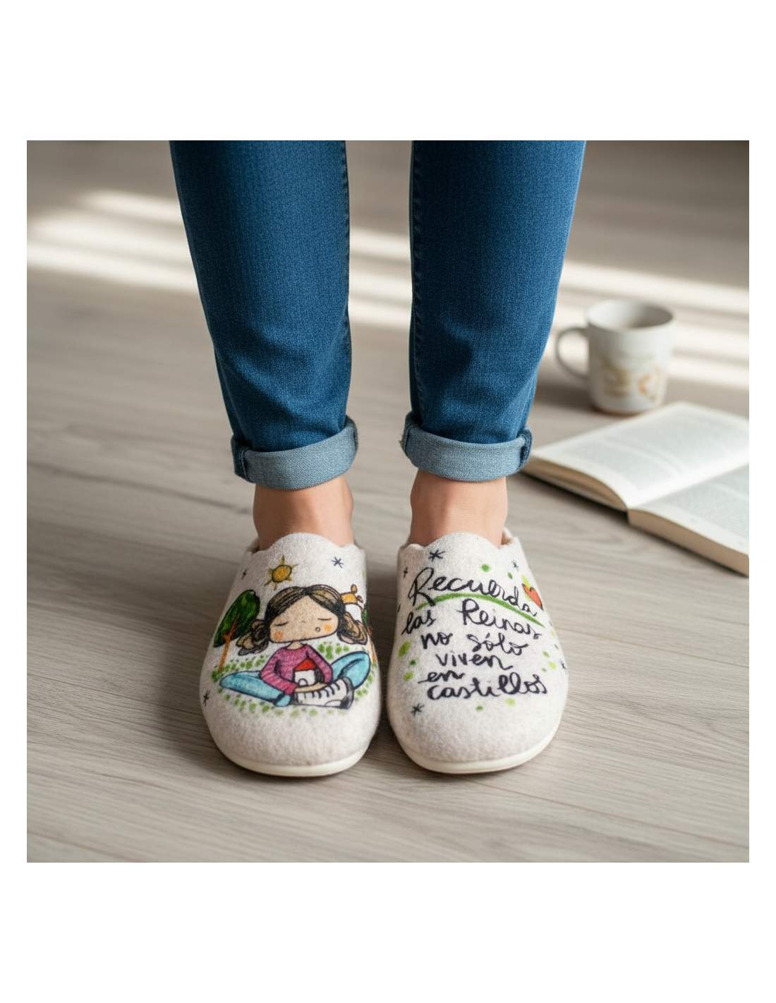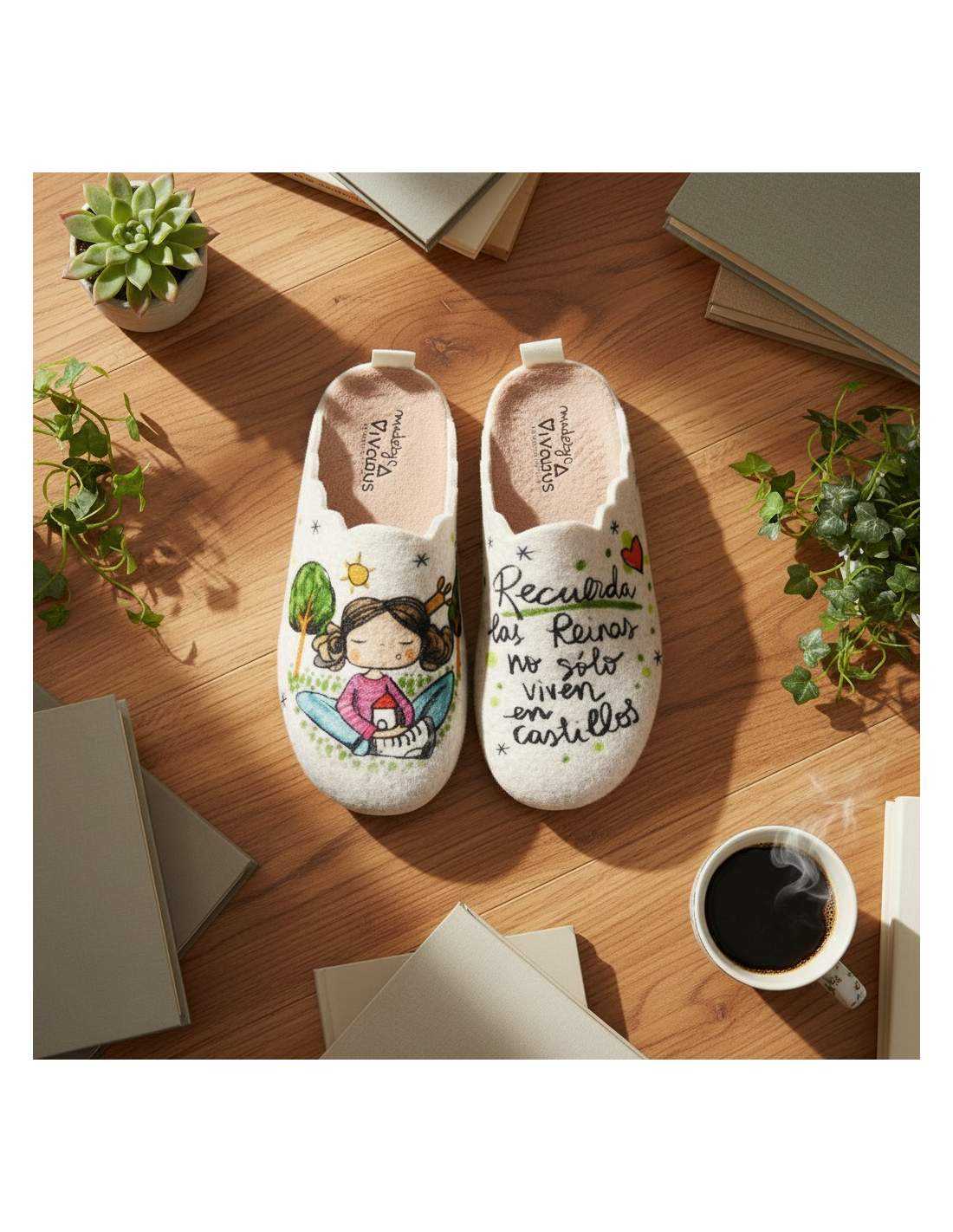 • Zapatillas de estar por casa con ilustración original y frase motivadora.
